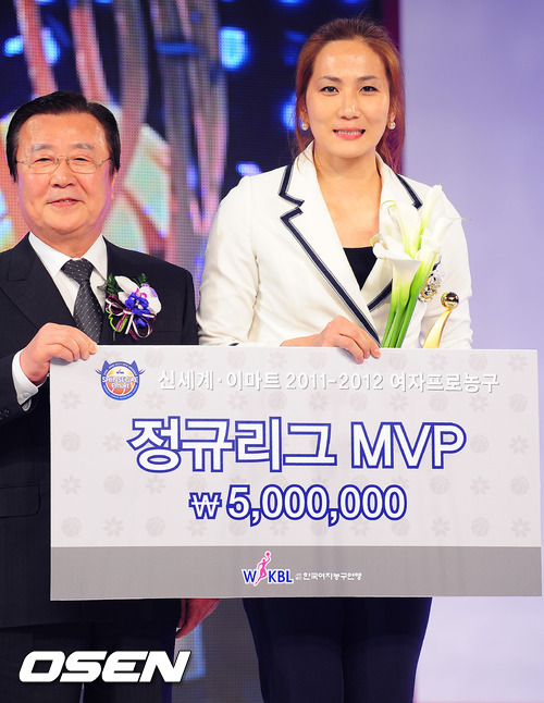 9일 오후 서울 용산구 한남동 그랜드하얏트호텔 그랜드볼룸에서 열린 WKBL 신세계이마트 2011-2012 여자프로농구 시상식에서 신정자가 정규리그 MVP를 수상하고 있다.