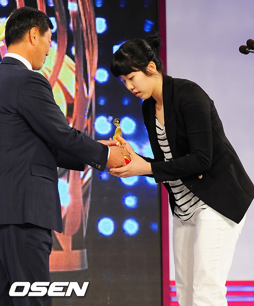 9일 오후 서울 용산구 한남동 그랜드하얏트호텔 그랜드볼룸에서 열린 WKBL 신세계이마트 2011-2012 여자프로농구 시상식에서 이승아가 신인상을 수상하고 있다.