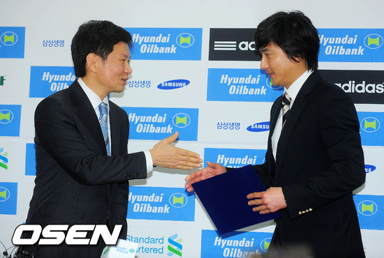 홍보대사로 위촉된 안정환 선수가 정몽규 총재와 악수를 나누고 있다.