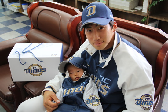 NC 다이노스의 나성범(23)이 주니어 다이노스 클럽(Jr. Dinos Club) 회원에게 선물을 직접 배달했다.