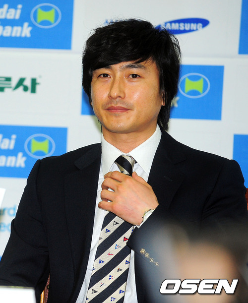 홍보대사로 위촉된 안정환이 넥타이를 고쳐 매고 있다.