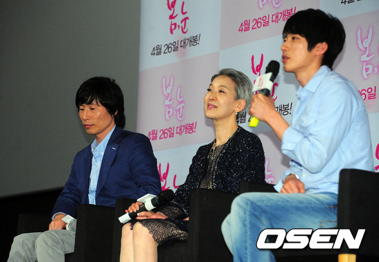 9일 오후 서울 왕십리 CGV에서 진행된 영화 '봄,눈(김태균 감독)' 언론배급시사회에서 윤석화가 임지규의 대답을 듣고 있다.