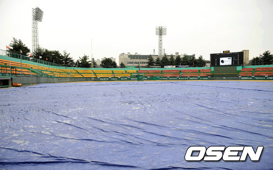10일 오후 청주야구장에서 열린 '2012 팔도 프로야구' 한화 이글스와 두산 베어스의 경기, 경기 전 오전부터 내리는 비로 인해 그라운드에 방수포가 덮여 있다.