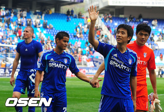 경기를 마치고 수원 오범석이 팬들에게 인사를 하고 있다. /ouxou@osen.co.kr