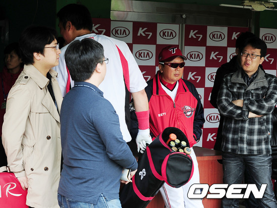 11일 오후 광주구장에서 열린 '2012 팔도 프로야구' KIA 타이거즈와 삼성 라이온즈의 경기, 경기전 KIA 최희섭이 훈련을 마치고 더그아웃으로 향하며 취재진과 이야기를 나누는 선동렬 감독 옆을 지나고 있다.