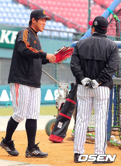 11일 오후 서울 잠실구장에서 열리는'2012 팔도 프로야구' LG 트윈스와 롯데 자이언츠의 경기전 롯데 전준우가 LG 김무관 타격 코치에게 인사를 하고 있다. 김무관 타격코치는 올해 LG로 팀을 옮겼다.
