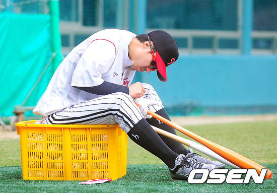 11일 오후 서울 잠실구장에서 열리는'2012 팔도 프로야구' LG 트윈스와 롯데 자이언츠의 경기전 LG 정성훈이 방망이를 손질하고 있다.