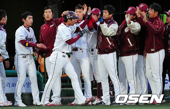 11일 오후 서울 목동구장에서 열린 '2012 팔도 프로야구' 넥센 히어로즈와 SK 와이번스의 경기 2회말 1사 강정호가 솔로포를 치고 덕아웃에서 동료들과 하이파이브를 하고 있다.
