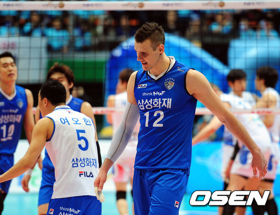 11일 오후 인천 도원체육관에서 열린 '2011-2012 NH농협 V리그' 남자부 챔피언결정전 3차전 대한항공과 삼성화재의 경기 1세트 삼성 가빈의 아쉬워 하고 있다.