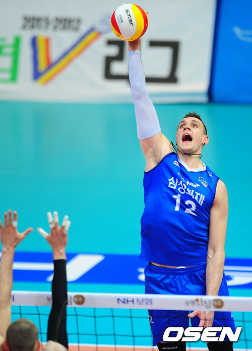 11일 오후 인천 도원체육관에서 열린 '2011-2012 NH농협 V리그' 남자부 챔피언결정전 3차전 대한항공과 삼성화재의 경기에서 삼성화재 가빈이 연타를 넣고 있다.