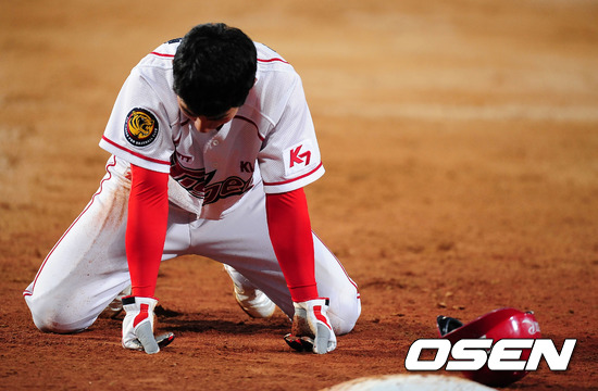 11일 오후 광주구장에서 열린 '2012 팔도 프로야구' KIA 타이거즈와 삼성 라이온즈의 경기, 2회말 2사 1,3루에서 KIA 홍재호가 견제사를 당하며 아쉬워하고 있다.