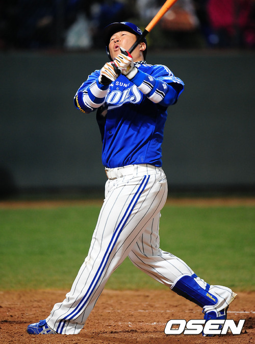 11일 오후 광주구장에서 열린 '2012 팔도 프로야구' KIA 타이거즈와 삼성 라이온즈의 경기, 4회초 2사에서 삼성 최형우가 KIA 윤석민의 몸쪽 볼에 깜짝 놀라고 있다.