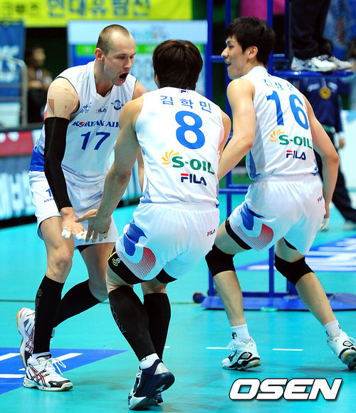 11일 오후 인천 도원체육관에서 열린 '2011-2012 NH농협 V리그' 남자부 챔피언결정전 3차전 대한항공과 삼성화재의 경기 2세트 대한항공 마틴이 득점을 하고 김학민, 진상헌과 기뻐 하고 있다.