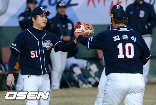 11일 오후 청주야구장에서 열린 '2012 팔도 프로야구' 한화 이글스와 두산 베어스의 경기, 1회말 1사 1루 한화 장성호의 외야플라이때 두산 임태훈이 귀루하는 1루주자 한상훈을 아웃으로 처리하고 최준석과 하이파이브를 하고 있다.