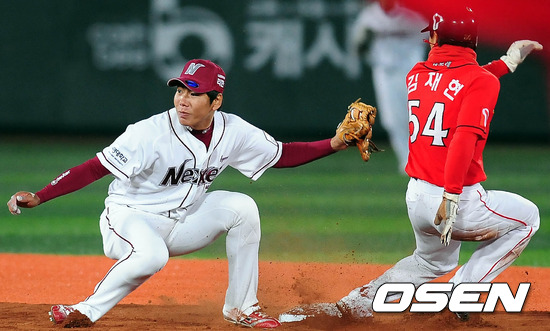 11일 오후 서울 목동구장에서 열린 '2012 팔도 프로야구' 넥센 히어로즈와 SK 와이번스의 경기 2사 1루 박진만의 타석, 대주자 김재현이 2루 도루에 성공하고 있다.
