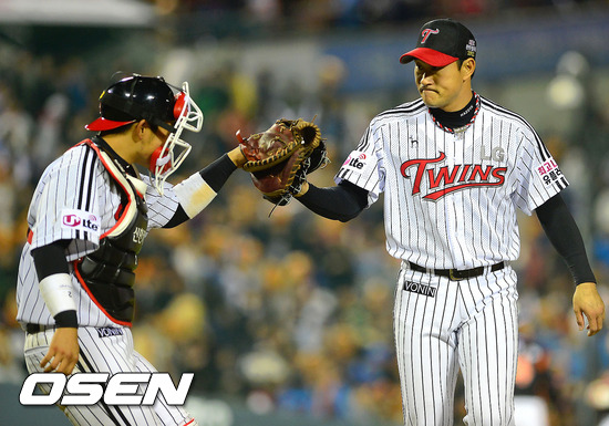11일 오후 서울 잠실구장에서 열린'2012 팔도 프로야구' LG 트윈스와 롯데 자이언츠의 홈 개막전 경기 6회초 LG 봉중근 투수가 롯데 공격을 막은 후 유강남 포수와 하이파이브를 하고 있다.