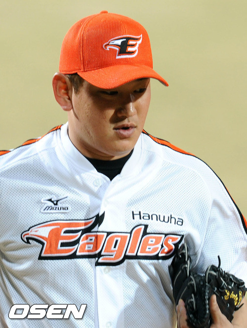 11일 오후 청주야구장에서 열린 '2012 팔도 프로야구' 한화 이글스와 두산 베어스의 경기, 6회초 2사 1루 두산 정수빈 타석때 한화 양훈이 마운드를 내려가고 있다. 양훈은 5⅔이닝 6실점을 기록했다.