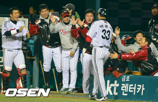 11일 오후 서울 잠실구장에서 열린'2012 팔도 프로야구' LG 트윈스와 롯데 자이언츠의 홈 개막전 경기 5회말 2사 3루 LG 최동수의 동점 적시타때 3루 주자 박용택이 홈을 밟은 후 동료들의 축하를 받고 있다