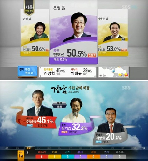 SBS 개표방송 '2012 국민의 선택'이 출마 후보의 정치적 성향을 명시해 눈길을 끌고 있다.