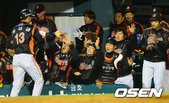 11일 오후 서울 잠실구장에서 열린'2012 팔도 프로야구' LG 트윈스와 롯데 자이언츠의 홈 개막전 경기 8회초 1사 2,3루 롯데 문규현의 희생번트때 3루 주자 황재균이 홈을 밟은 후 동료들의 축하를 받고 있다.
