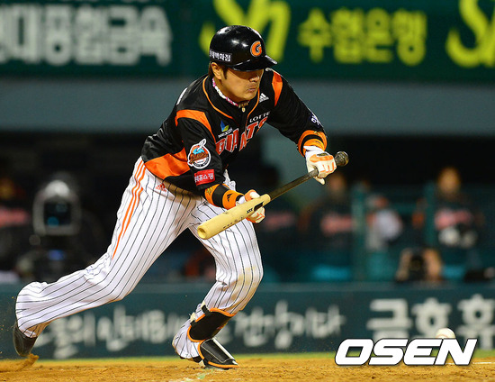 11일 오후 서울 잠실구장에서 열린'2012 팔도 프로야구' LG 트윈스와 롯데 자이언츠의 홈 개막전 경기 8회초 2,3루 롯데 문규현이 희생번트를 시도하고 있다. 3루 주자 황재균이 득점.