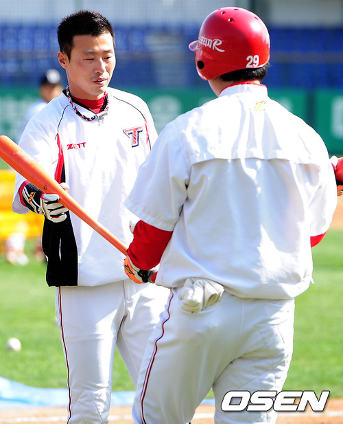 경기전 KIA 김원섭과 나지완이 배팅 훈련을 하며 이야기를 나누고 있다.