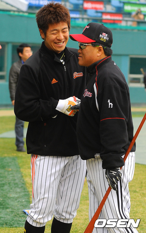 12일 오후 서울 잠실구장에서 열리는'2012 팔도 프로야구' LG 트윈스와 롯데 자이언츠의 경기전 롯데 강민호가 LG 김무관 타격코치와 이야기를 나누고 있다.