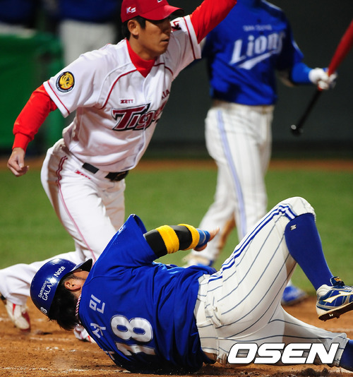 3회초 2사 2루에서 삼성 박석민이 KIA 조태수의 폭투를 틈타 홈에서 세이프되고 있다.