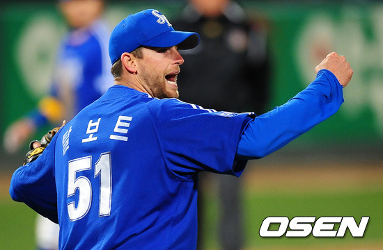 3회말 2사 2루에서 삼성 탈보트가 KIA 신종길을 내야땅볼로 처리하고 주먹을 불끈 쥐며 기뻐하고 있다.