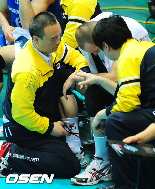12일 오후 인천 도원체육관에서 열린 '2011-2012 NH농협 V리그' 남자부 챔피언결정전 4차전 대한항공과 삼성화재의 경기에서 대한항공 마틴이 부상으로 교체된 후 고통스러워 하고 있다.