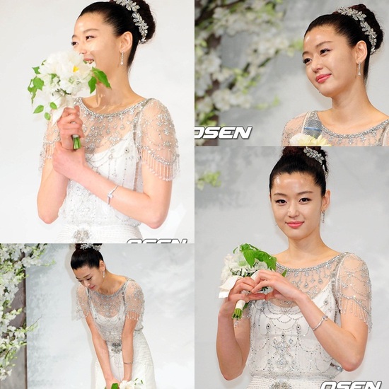 비즈 장식의 제니팩햄 웨딩드레스로 우아하면서도 화려한 매력을 선보인 전지현은 포토타임에 경직된 얼굴을 보여 사회자가 “한 번 웃어 달라”고 여러 번 요청하기도 했다.