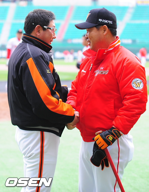 13일 오후 인천 문학야구장에서 '2012 팔도 프로야구' SK 와이번스와 한화 이글스의 경기가 열릴 예정인 가운데 훈련시간에 한화 한대화 감독과 SK 이만수 감독이 포옹을 나눈 후 악수를 나누며 얘기를 하고 있다.