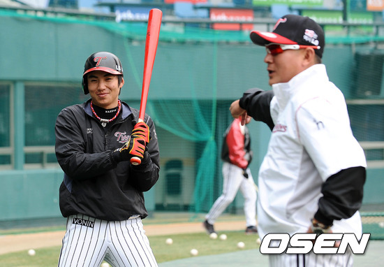 13일 오후 서울 잠실야구장에서 열린 '2012 팔도 프로야구' LG 트윈스와 KIA 타이거즈의 경기, 경기 전 타격 훈련 중인 LG 이대형이 김기태 감독의 타격 지도를 받으며 미소 짓고 있다.