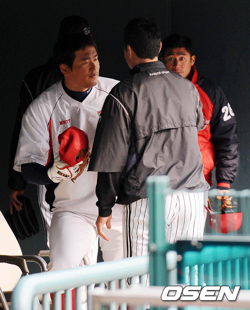 13일 오후 서울 잠실야구장에서 열린 '2012 팔도 프로야구' LG 트윈스와 KIA 타이거즈의 경기, 경기 전 KIA 최희섭이 LG 최동수와 더그아웃에서 이야기를 나누고 있다.