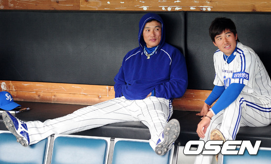 13일 오후 대구구장에서 열린 '2012 팔도 프로야구' 삼성 라이온즈와 넥센 히어로즈의 경기에 앞서 비가 내리자 삼성 이승엽과 김상수가 더그아웃에서 이야기를 나누고 있다.