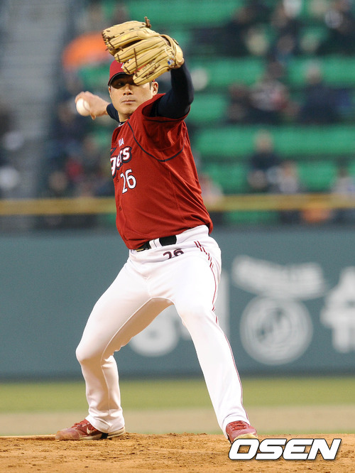 13일 오후 서울 잠실야구장에서 열린 '2012 팔도 프로야구' LG 트윈스와 KIA 타이거즈의 경기, 1회말 KIA 선발 서재응이 힘차게 공을 던지고 있다.