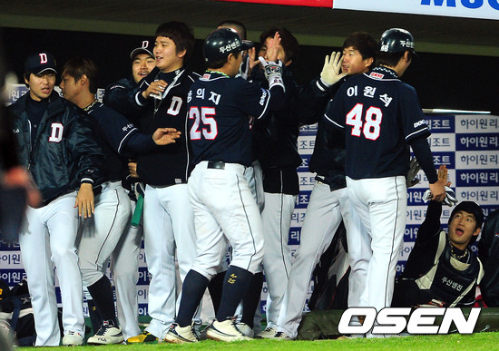 13일 부산 사직구장에서 열린 '2012 팔도 프로야구' 롯데 자이언츠와 두산 베어스의 경기 5회초 1사 2,3루 두산 고영민의 역전 2타점 적시타때 2,3루 주자 양의지와 이원석이 홈을 밟은 뒤 동료들의 축하를 받고 있다.