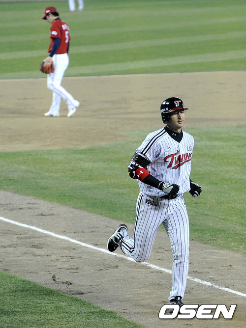 13일 오후 서울 잠실야구장에서 열린 '2012 팔도 프로야구' LG 트윈스와 KIA 타이거즈의 경기, 4회말 무사에서 LG 박용택이 우중월 솔로 홈런을 치고 그라운드를 돌고 있다.