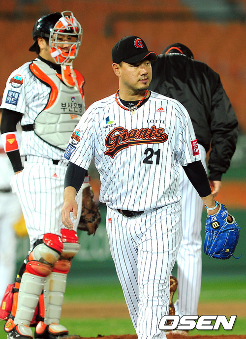 13일 부산 사직구장에서 열린 '2012 팔도 프로야구' 롯데 자이언츠와 두산 베어스의 경기 7회초 롯데 송승준 선발투수가 두산 선두타자 이종욱에게 볼넷을 허용한뒤 강판되고 있다. 이날 송승준은 6이닝 4실점했다.