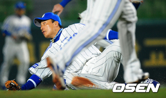 13일 오후 대구구장에서 열린 '2012 팔도 프로야구' 삼성 라이온즈와 넥센 히어로즈의 경기, 7회초 1사 1,2루에서 삼성 이승엽이 넥센 오윤의 내야 타구를 몸 날려 잡아내고 있다.