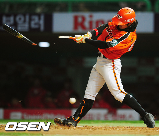 13일 오후 인천 문학야구장에서 '2012 팔도 프로야구' SK 와이번스와 한화 이글스의 경기에서 8회초 2사 주자 1, 2루 한화 한상훈 타석에서 배트가 부러지며 공이 발에 맞고 튀고 있다.