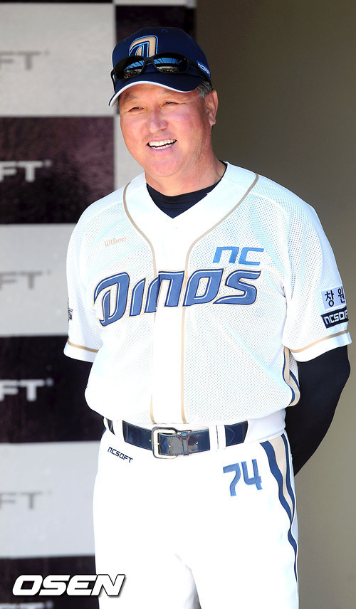 14일 오후 경남 창원 마산구장에서 열린 NC다이노스와 롯데 자이언츠의 퓨처스리그 경기 전 NC다이노스 김경문 감독이 미소를 지으며 더그아웃을 바라보고 있다.