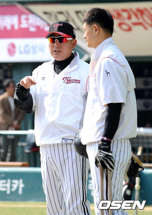 14일 오후 서울 잠실야구장에서 열린 '2012 팔도 프로야구' LG 트윈스와 KIA 타이거즈의 경기, 경기 전 LG 김기태 감독이 심광호에게 조언을 해주고 있다.