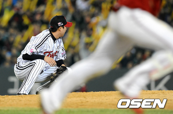 14일 오후 서울 잠실야구장에서 열린 '2012 팔도 프로야구' LG 트윈스와 KIA 타이거즈의 경기, 7회초 무사 1루에서 LG 우규민이 KIA 김선빈의 타구를 빠뜨리고 아쉬운 듯 바라보고 있다.