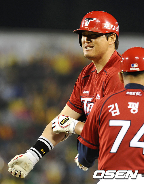 14일 오후 서울 잠실야구장에서 열린 '2012 팔도 프로야구' LG 트윈스와 KIA 타이거즈의 경기, 7회초 2사 KIA 최희섭이 우전 안타를 치고 미소를 짓고 있다.