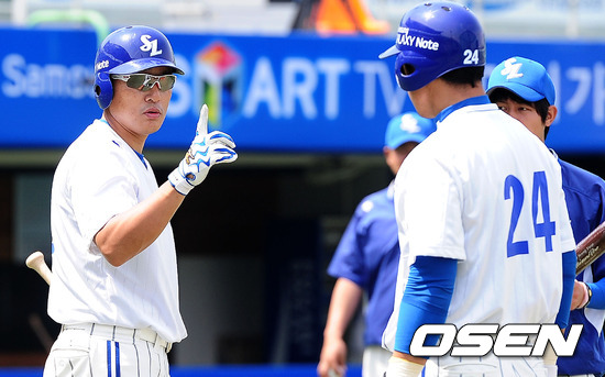 15일 오후 대구구장에서 열린 '2012 팔도 프로야구' 삼성 라이온즈와 넥센 히어로즈의 경기에 앞서 삼성 이승엽이 배팅 훈련을 하며 동료선수들과 이야기를 나누고 있다.
