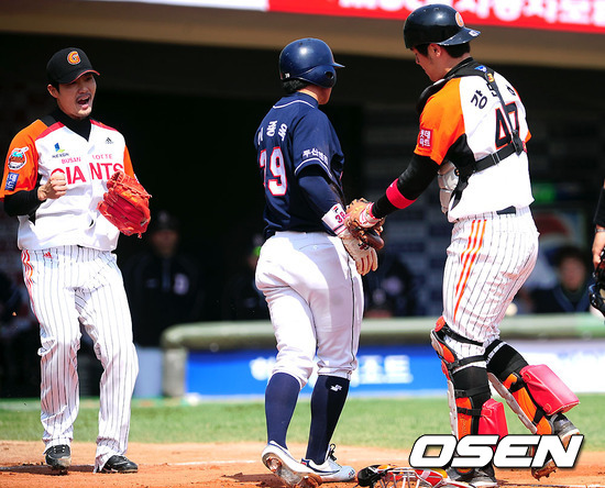 15일 부산 사직구장에서 열린 '2012 팔도 프로야구' 롯데 자이언츠와 두산 베어스의 경기 1회 1사 두산 이원석의 외야뜬공때 롯데 강민호 포수가 3루 주자 이종욱을 태그아웃 시키고 있다.