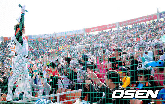 15일 부산 사직구장에서 열린 '2012 팔도 프로야구' 롯데 자이언츠와 두산 베어스의 경기 중 롯데 조지훈 응원단장이 멋진 응원을 펼치고 있다