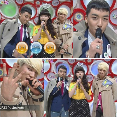 15일 오후 생방송으로 진행된 '인기가요'에서 대성과 승리는 일본 콘서트 차 방송에 불참한 카라의 구하라와 니콜 대신 MC 마이크를 잡고 아이유와 호흡을 맞췄다.