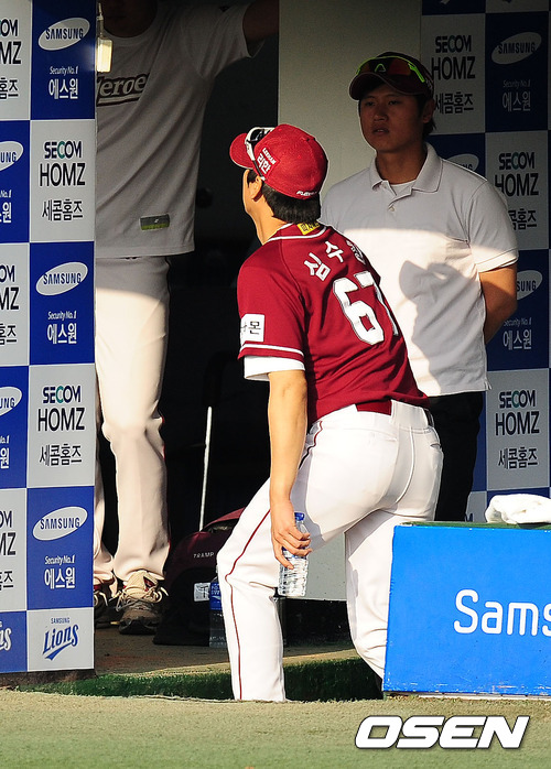 15일 오후 대구구장에서 열린 '2012 팔도 프로야구' 삼성 라이온즈와 넥센 히어로즈의 경기, 8회말 삼성이 동점을 만들자 경기를 지켜보던 넥센 선발투수 심수창이 더그아웃을 나서고 있다.